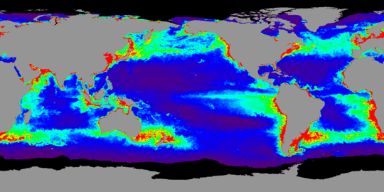 ![]() Standard Product: Net Primary Production using MODIS CHL SST, PAR, and z_eu = f(CHL) as inputs to the VGPM |